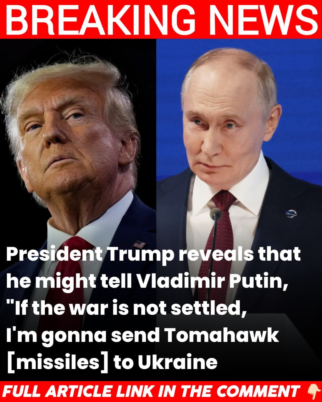 ![May be an image of text that says 'BREAKING NEWS President Trump reveals that he might tell Vladimir Putin, "If the war is not settled, I'm gonna send Tomahawk [missiles] to Ukraine FULL ARTICLE LINK IN THE COMMENT'](https://scontent-lga3-2.xx.fbcdn.net/v/t39.30808-6/564761666_122234894798125539_6721329369306448297_n.jpg?_nc_cat=105&ccb=1-7&_nc_sid=833d8c&_nc_ohc=ZFKZJ_aoFdEQ7kNvwGx3w24&_nc_oc=AdnZgS2O_kBYHb1OT5yrynz8SDlldgXSNZuRg7O-p19CQw3ehTFOLC1v3lQtC_TALjk&_nc_zt=23&_nc_ht=scontent-lga3-2.xx&_nc_gid=NtYmXt6whnc_VXtyXhlfUA&oh=00_AffUTqqsVof_vCrsxBqzEb1D9wkCMje76Gzm71FIU1jB4A&oe=68F2D8EA)