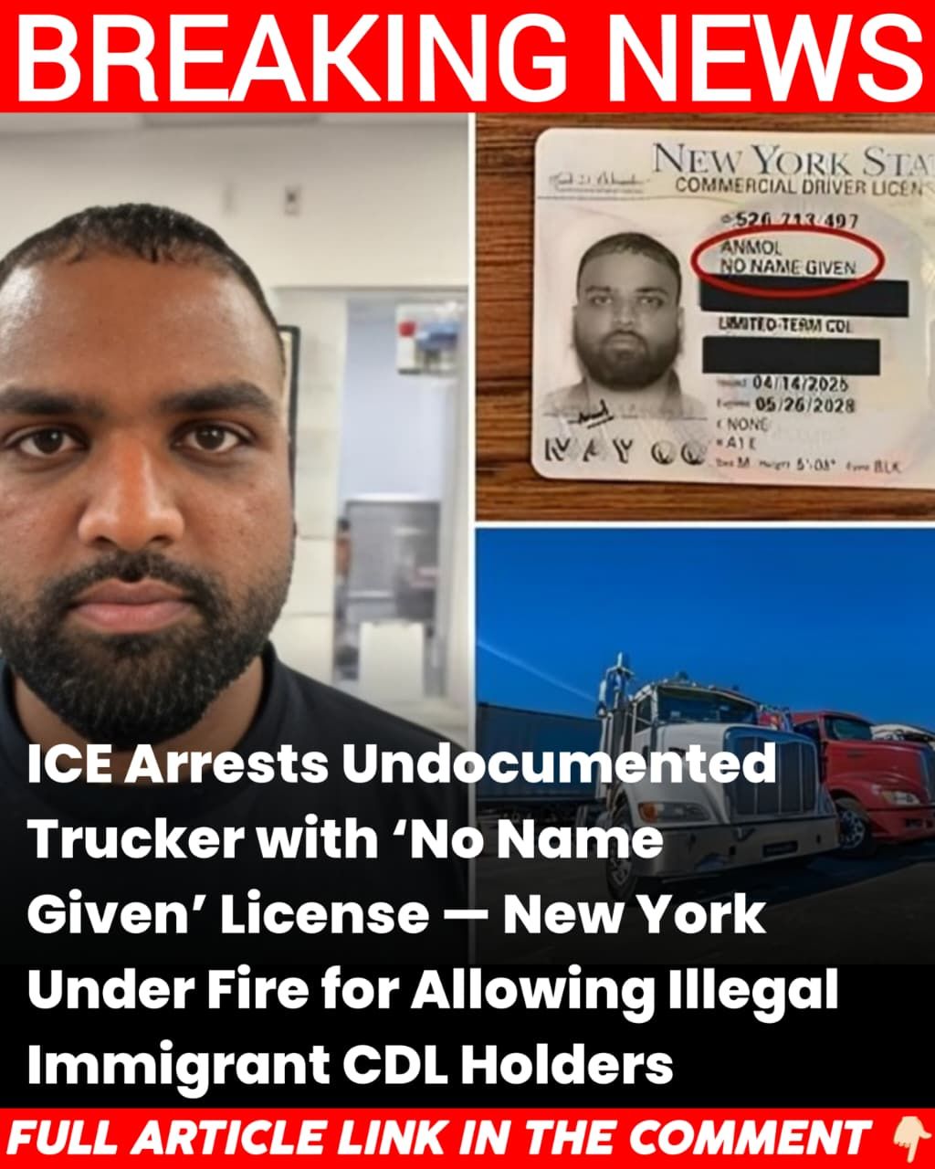 A shocking case out of Oklahoma has reignited the national debate over illegal immigration, government verification systems, and state-level sanctuary laws after ICE agents arrested an undocumented Indian national driving a semitruck with a commercial driver’s license (CDL) that listed his name as “No Name Given.” The driver, identified as Anmol Anmol, was detained during a highway inspection earlier this week. His license, issued in New York State and marked as REAL ID compliant, has triggered furious criticism from immigration officials and lawmakers who say the incident exposes a dangerous loophole in the system.